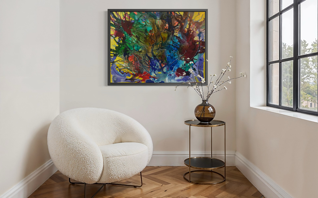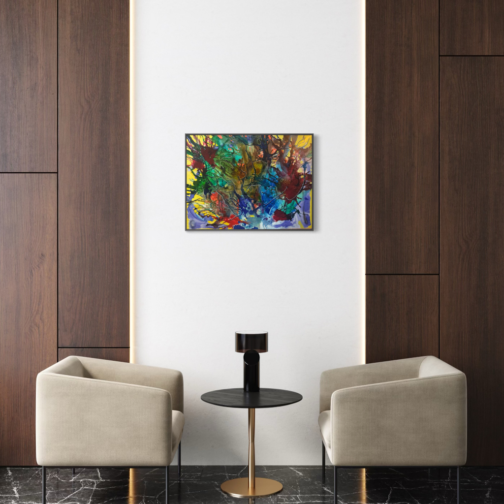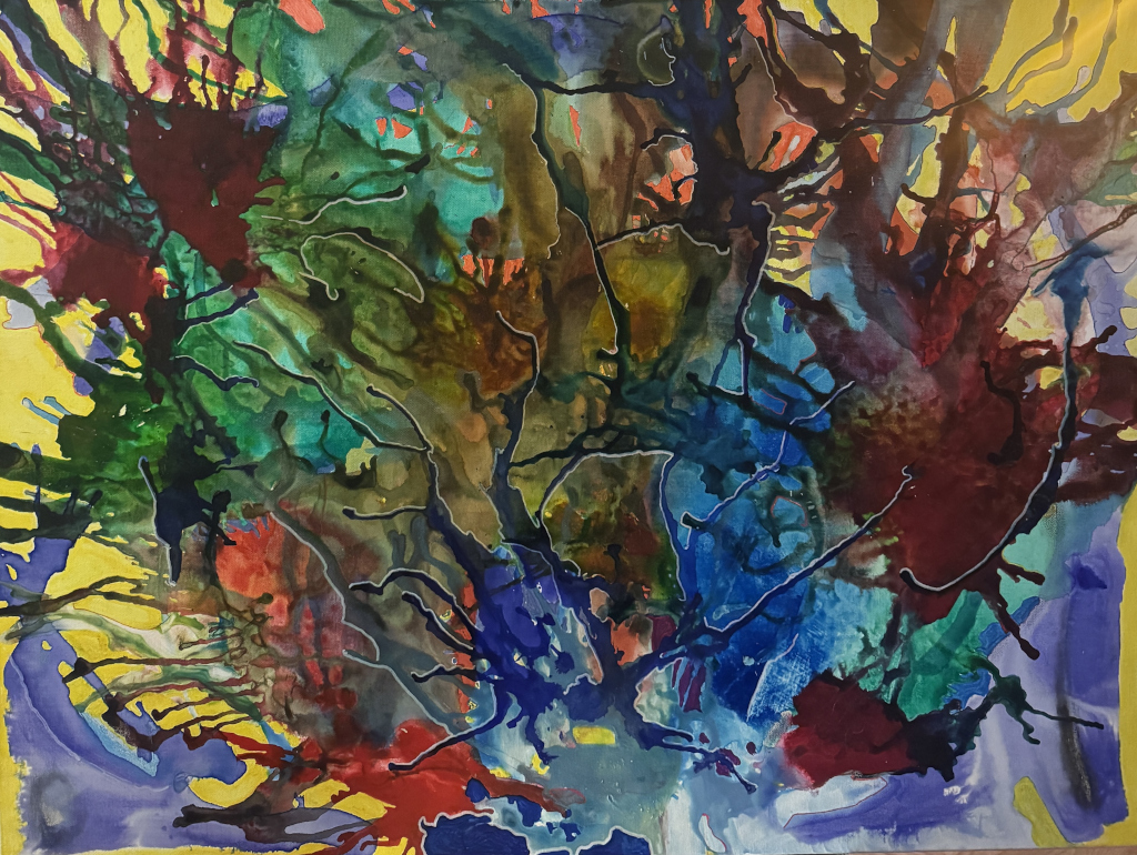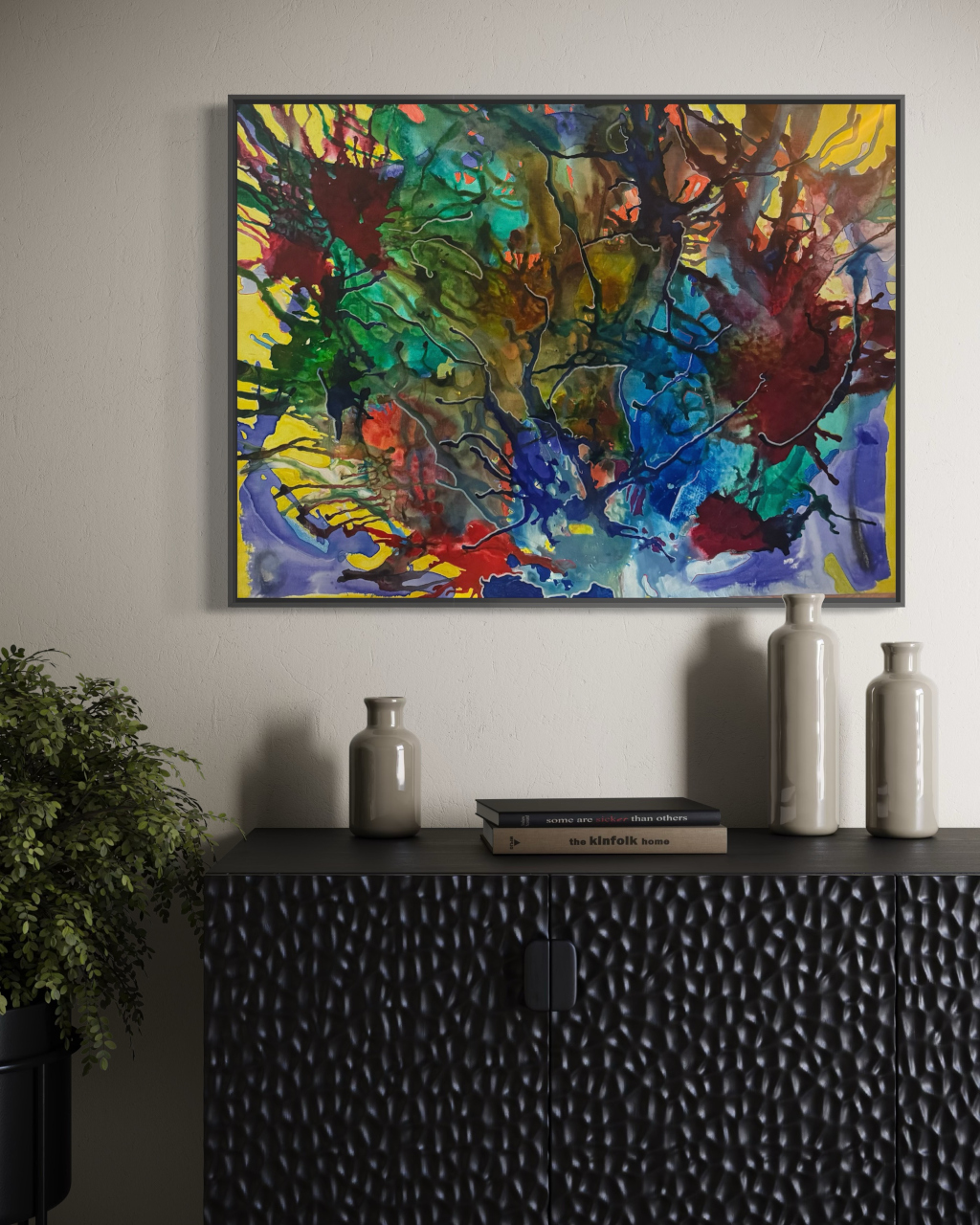 Toile coton 83X62 – cadre type caisse américaine – peintures acrylique encres et Posca – technique soufflerie à la paille.